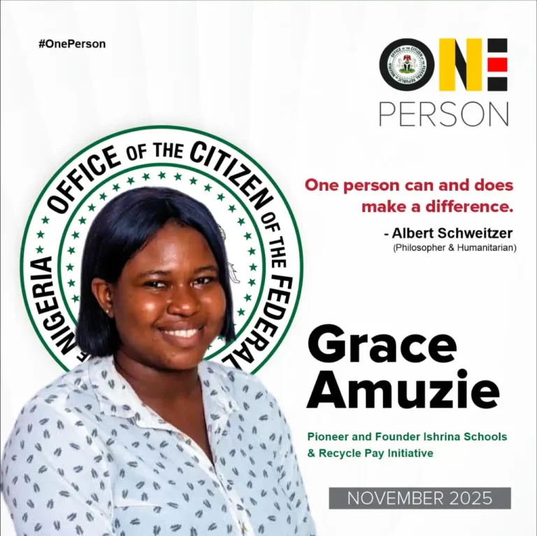Grace Amuzie is the founder of Isrina Schools in Ajegunle, Lagos, where she pioneered the “Recycle Pay” initiative that lets families pay tuition with recycled plastics. Her work is opening doors for children from low-income households and proving that sustainable education can begin in the most overlooked places.